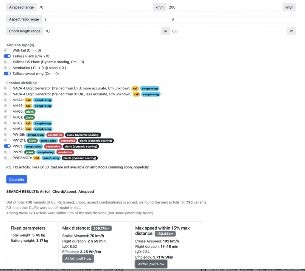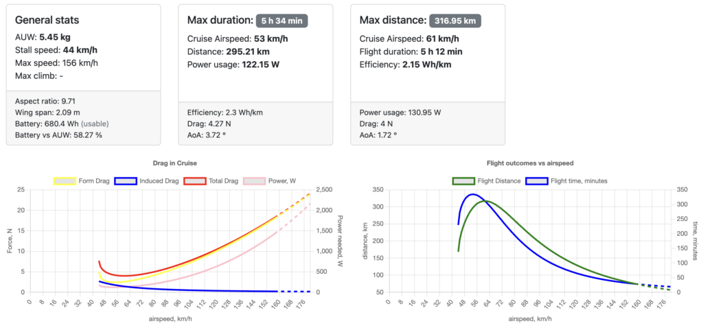 - simple aerodynamics calculator to predict optimal flight params for goals like max-range, max-duration